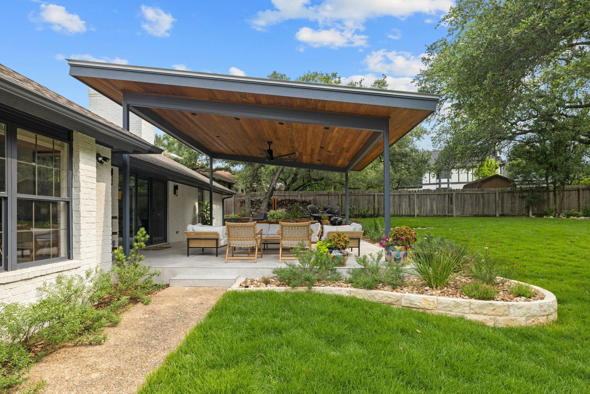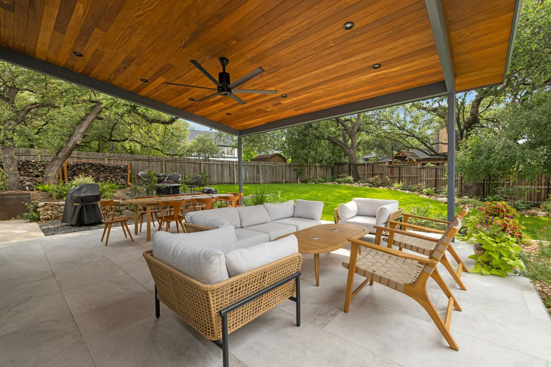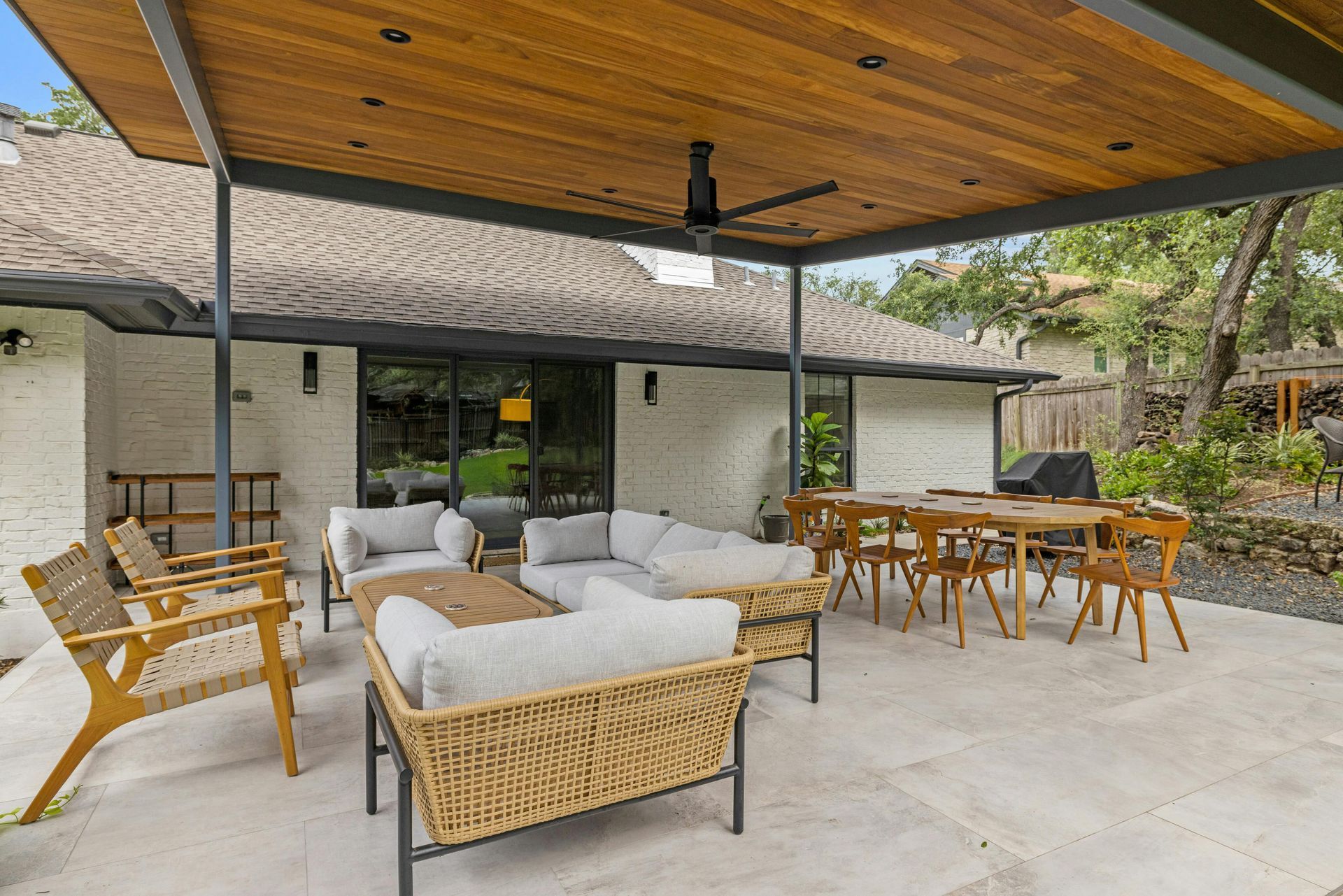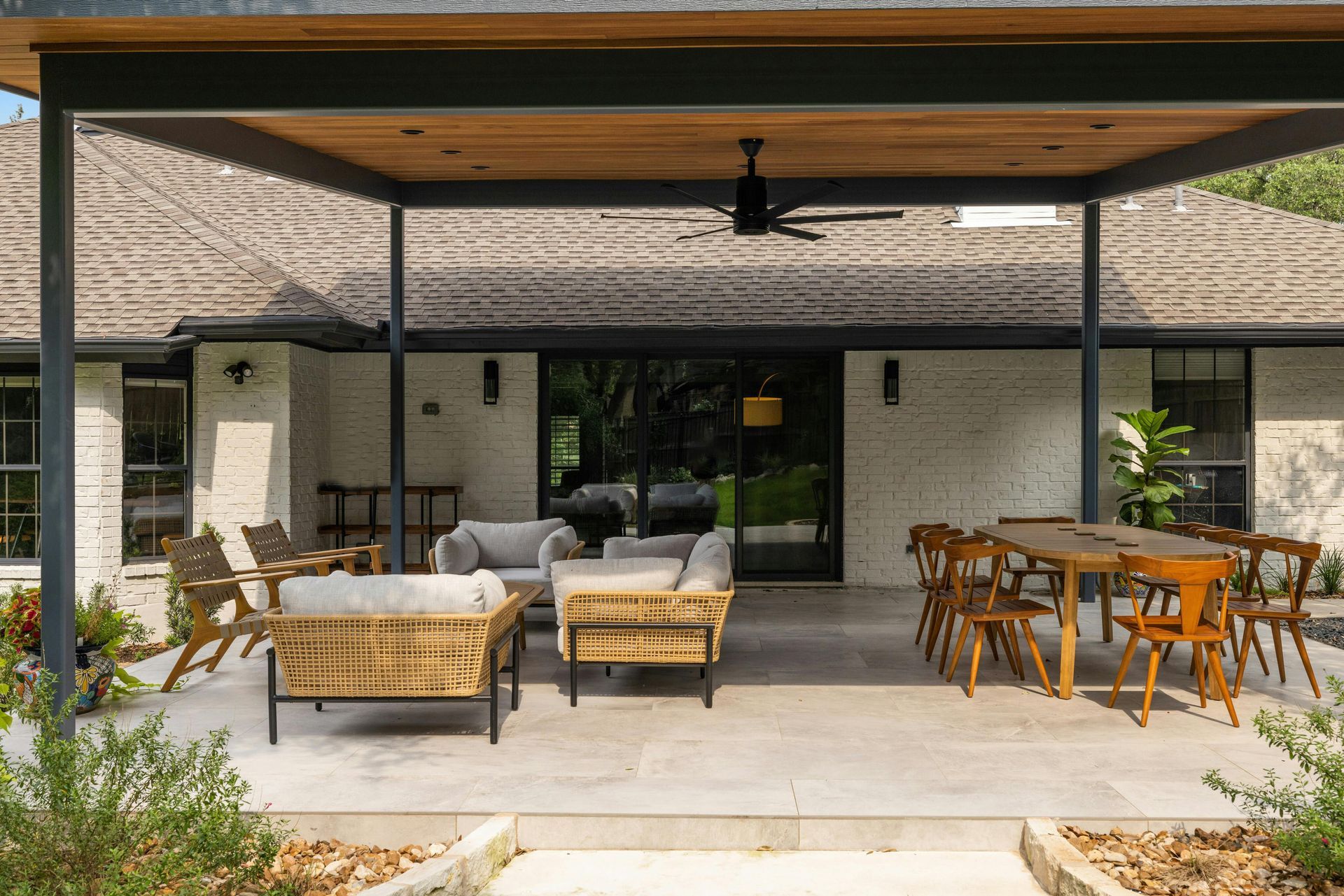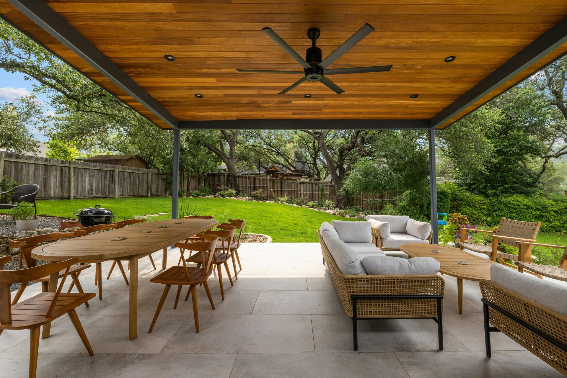 These simple covered patios are perfect for our Central Texas weather, blocking the sun and using a ceiling fan to comfortable environment even through our sweltering summers.