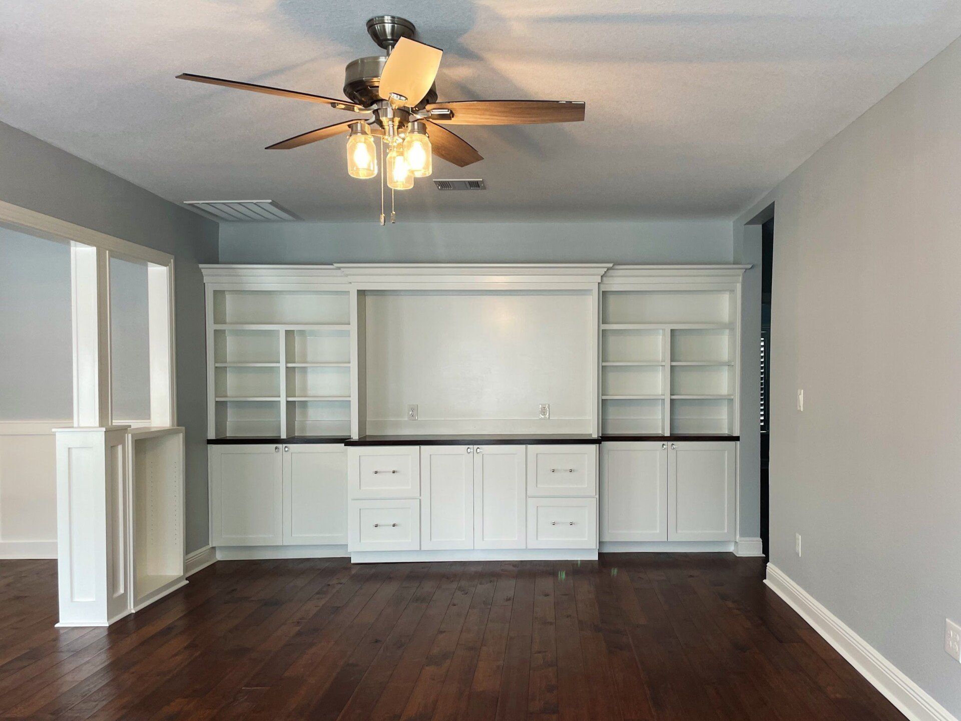Another project we will remember is Melanie’s kitchen. We love working for past clients and were thrilled when Melanie asked us to return to her home to work on her first floor remodel focusing on the kitchen. The final product has been an inspiration for many of our clients. She had committed to a white cabinet look, but not completely white on white. The island was chosen light gray, bringing some extra character into the space. Yet, the material that elevated the room was the beautiful gray glass backsplash she selected - simple, modern and elegant, the perfect addition for her beautiful new kitchen it brought the whole room to a more modern level. The contrast was brilliant, and once people stepped inside the kitchen, their eyes were instantly drawn to the backsplash, allowing room for the white cabinets to show off. We also loved the black hardware for the drawers and cabinets. Adding some open shelves, very functional and modern pantry cabinets, a new mantle face for some distinguishing touches, and French doors to close off to home offices - there were lots of great choices coming together. And our team loved her sweet little dog!
