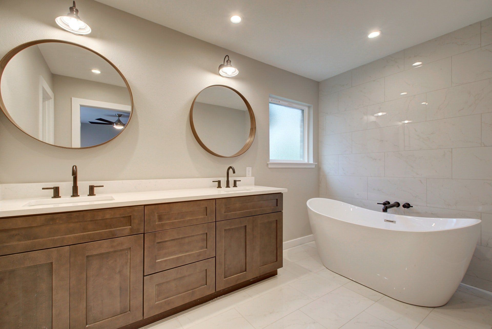The natural theme of the home comes through in the primary bath with the stained wood vanity, matching circular mirrors, and neutral flooring. The guest bath adds in more deco touches with classic white subway tile and black fixtures. Both are beautiful and align with the overall style of the home.