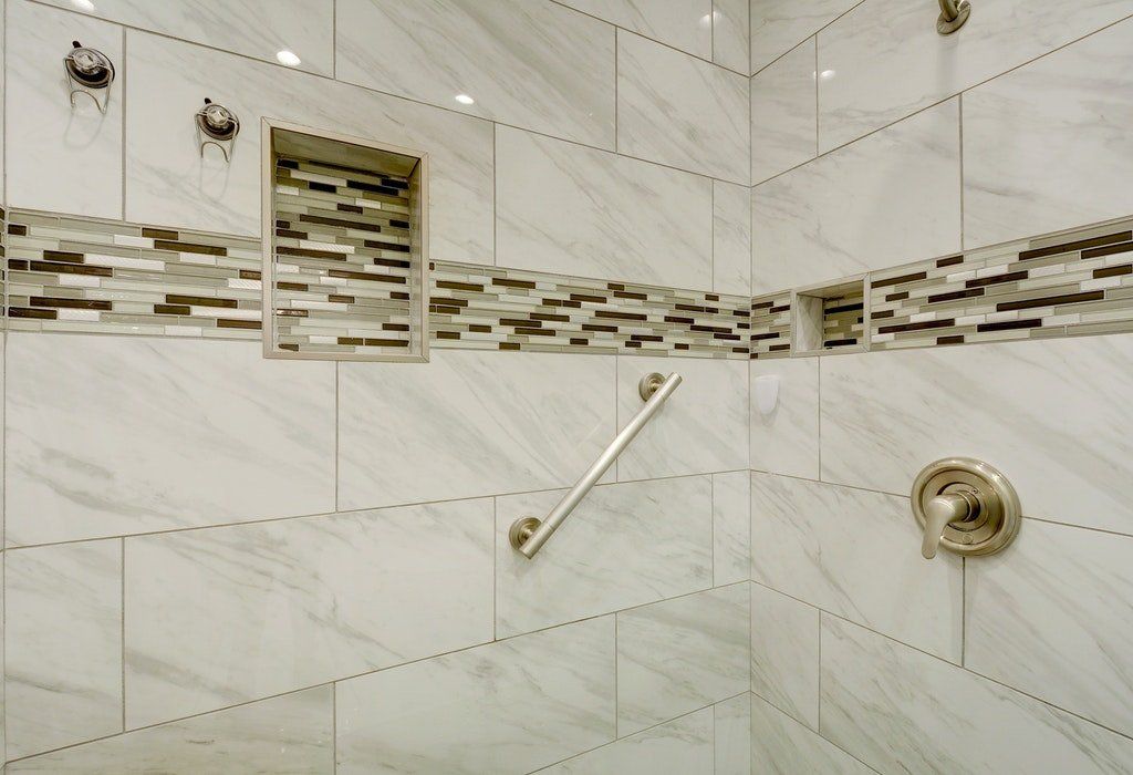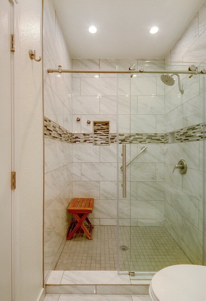 Downstairs we remodeled the existing primary bath with a walk in shower with grab bars.