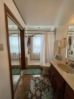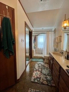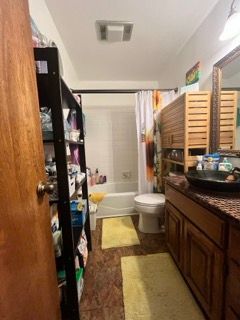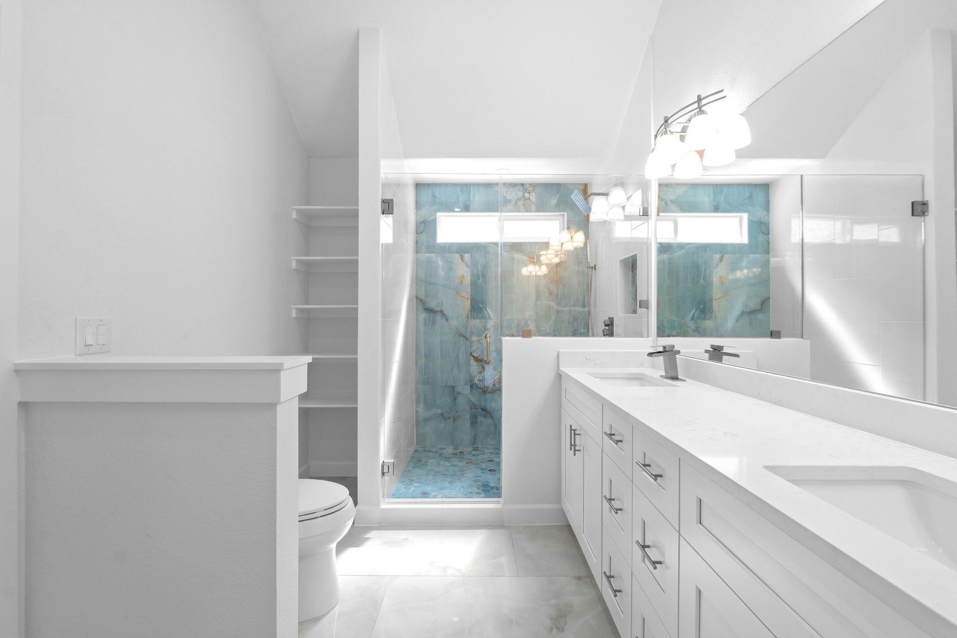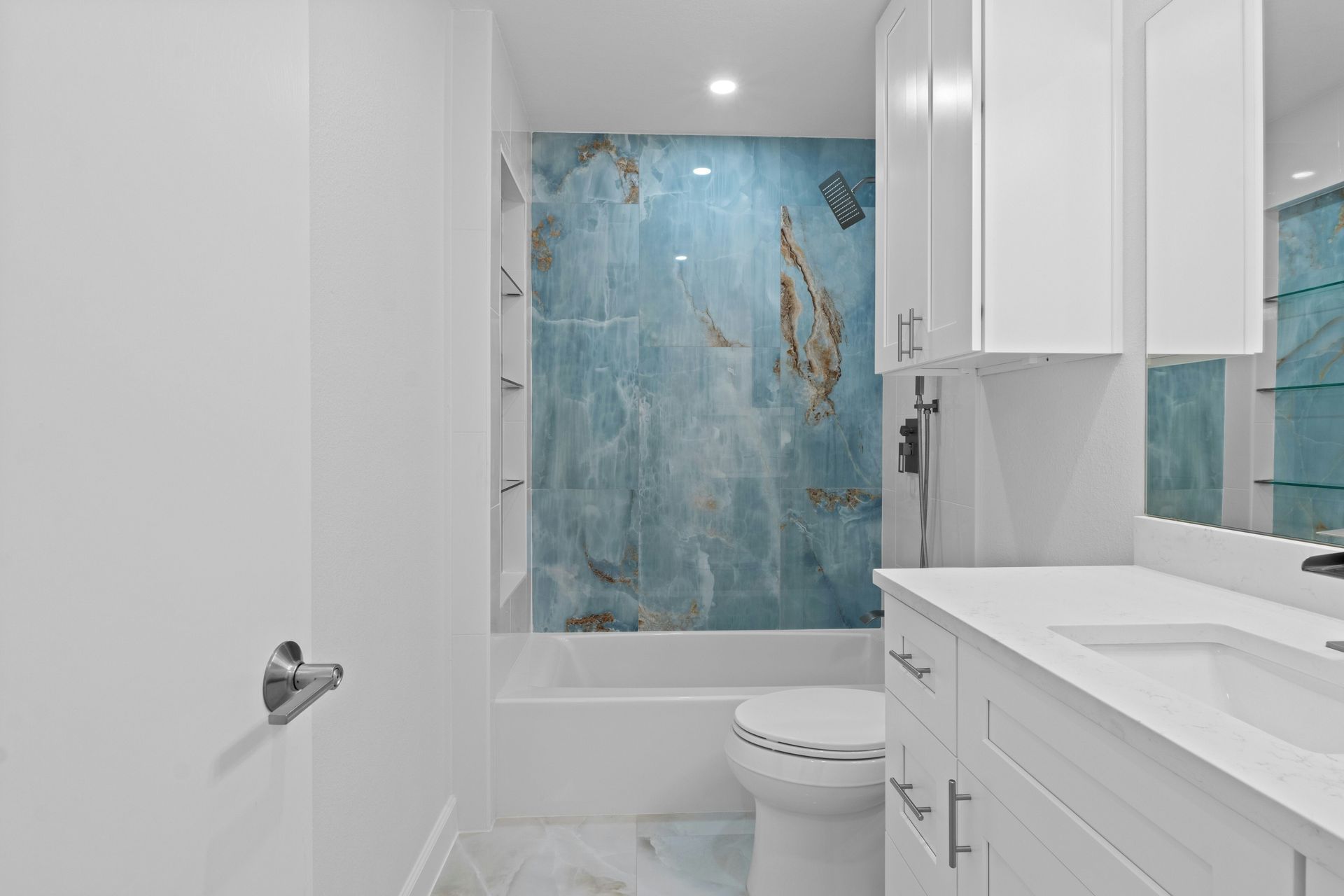 For the guest bath, a cosmetic remodel with the same theme as the primary bath, featuring a tall niche with glass shelves in the shower, providing extra storage snugged into the wall away from view.