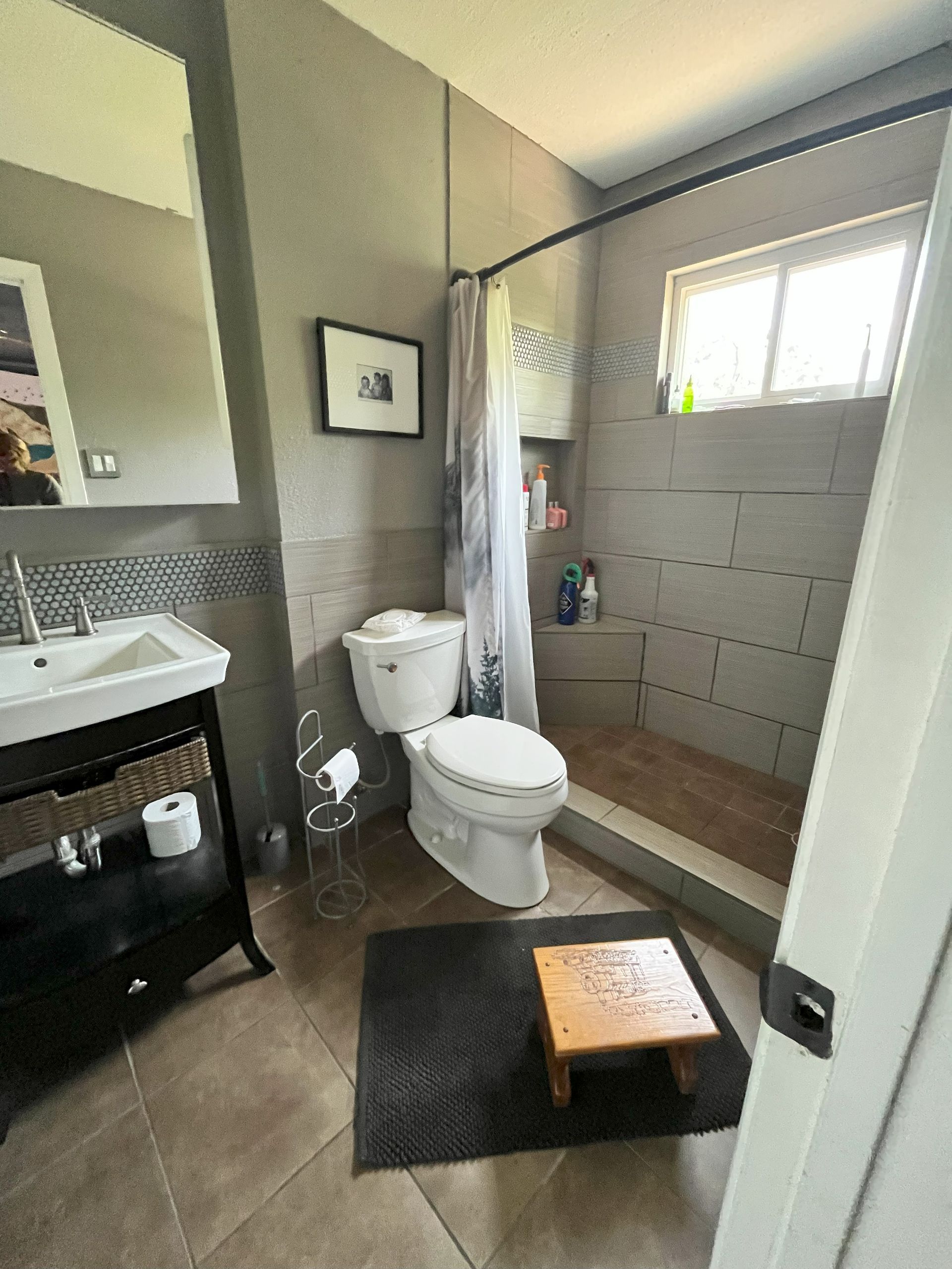 Both baths feature beautiful tiles, ceiling height linen storage, and keeping the rustic oak cabinet finish the homeowners fell in love with for all cabinetry throughout the home. We love the selections for tile and fixtures, and that the owners were able to expand their primary bath to allow for a larger shower area and more cabinetry.