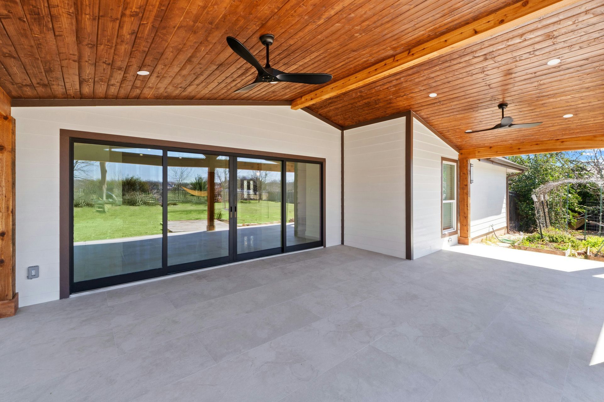 Out back, perhaps our favorite aspect of the project, replacing all old wood siding with durable hardie plank, adding a large sliding door allowing an expansive view of their beautiful property from inside the home, and over 300 square feet of covered porch. We are so glad they decided to upgrade to the cumaru hardwood ceiling for the outdoor porch, bringing a natural elegance to that space - gorgeous!