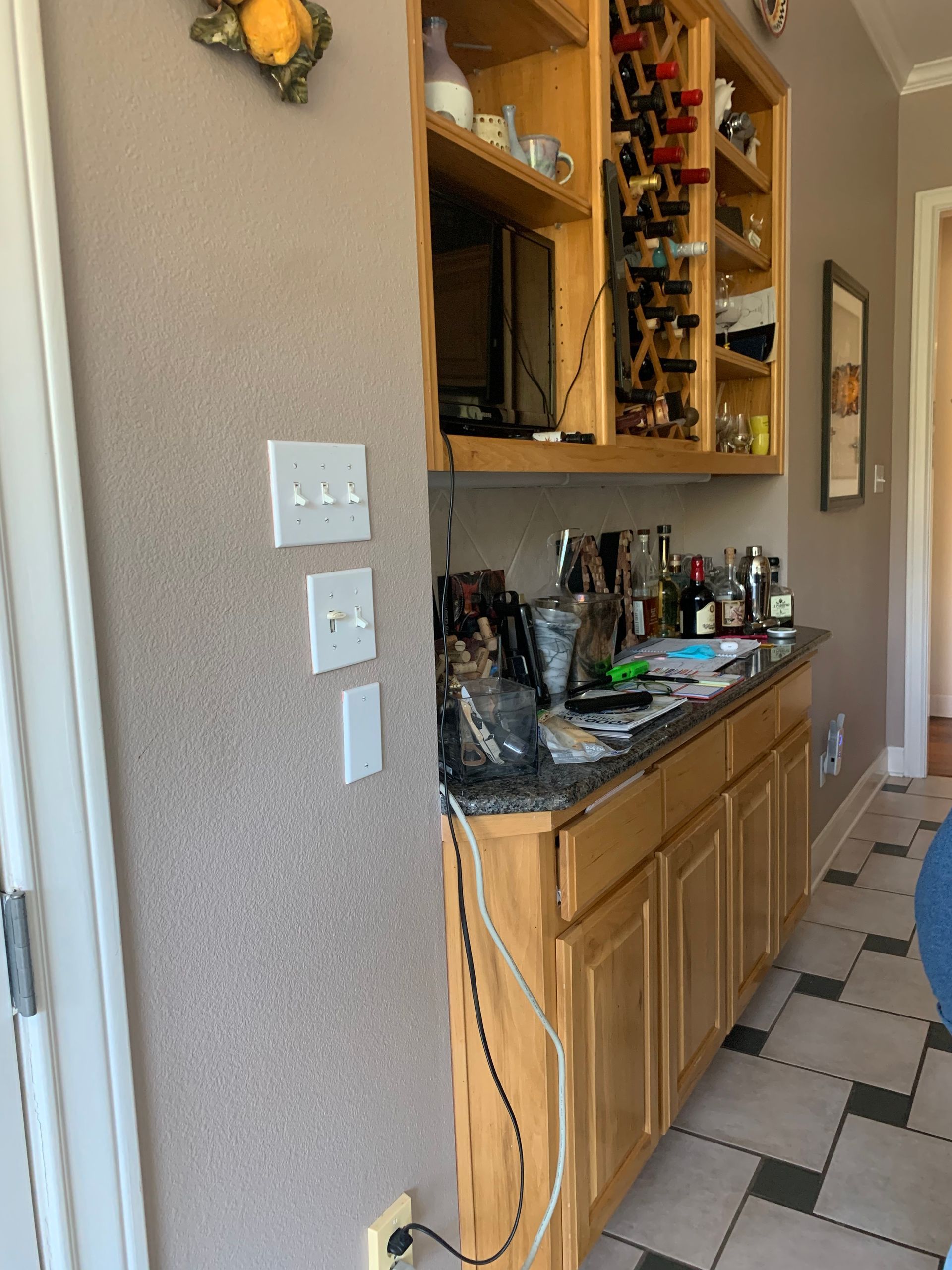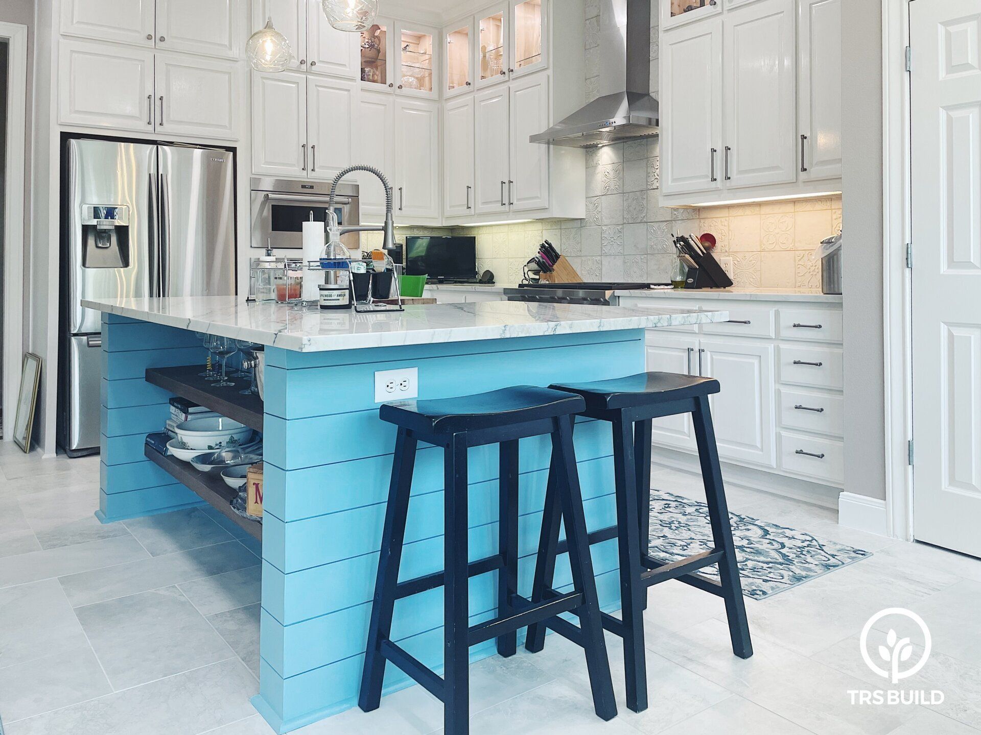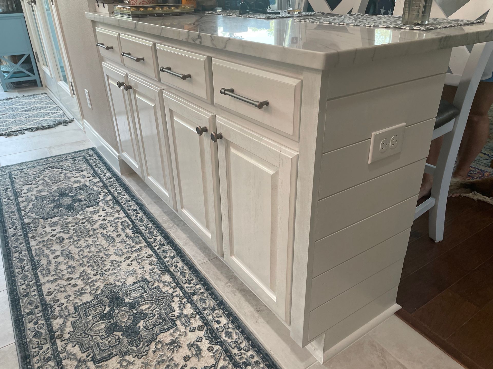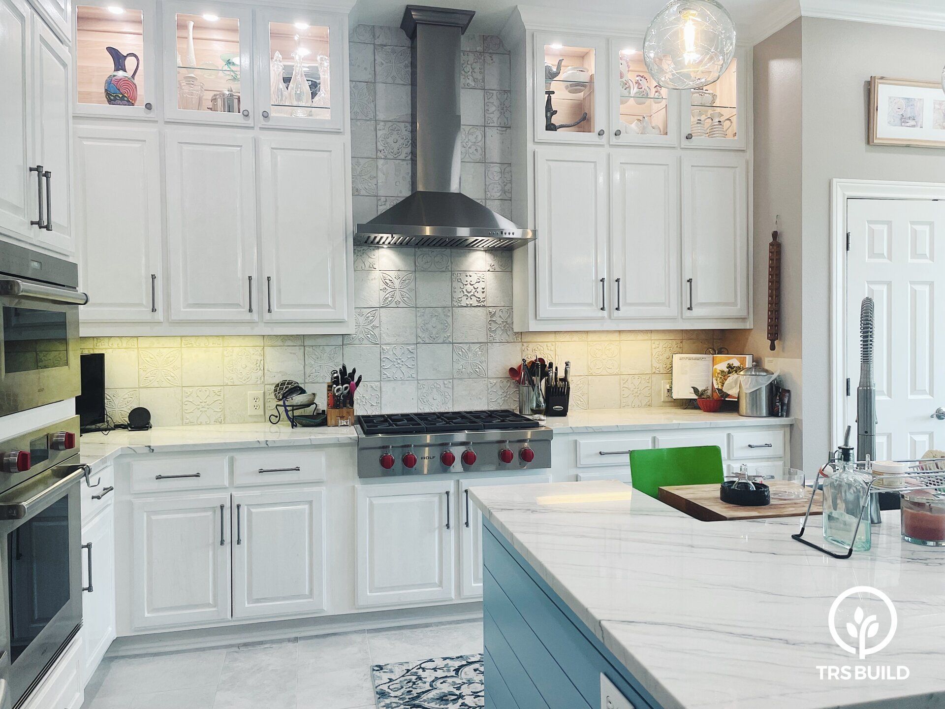 Austin, TX, 78759 - This family was looking for a lighter brighter look for their kitchen, open a load bearing wall between the kitchen and living room, and replace buffet cabinets with a peninsula to allow for a separate seating area when cooking for family events. A new countertop and improved island design, while keeping and adding to the original pecan cabinets. One design feature was to stain the cabinets with a white washed look that would allow for a lighter color while still allowing some of the grain of the pecan to show through. Custom carpentry and painting yielded a beautiful result that met the client’s desire for a brighter kitchen reminiscent of old world style with the fun of a day at the beach. Carpentry work included extending cabinets to ceiling height, island modifications to beautify the island (and new peninsula) with shiplap on end pieces and a new coffee station area. Topped with a beautiful quartzite counter, gorgeous handmade glass pendants, and herringbone pattern flooring. Simple colors loaded with texture and pattern for a beautiful result.