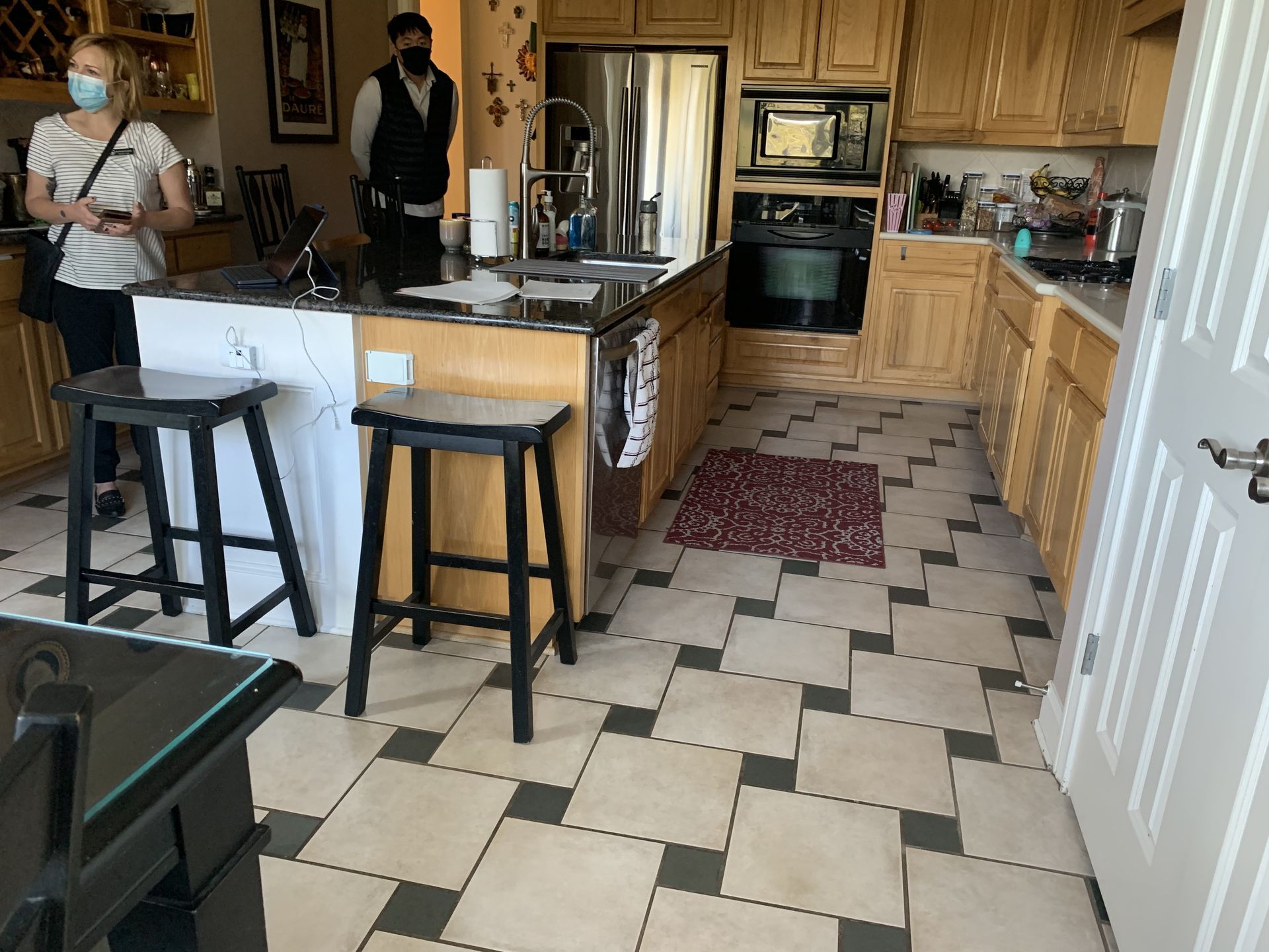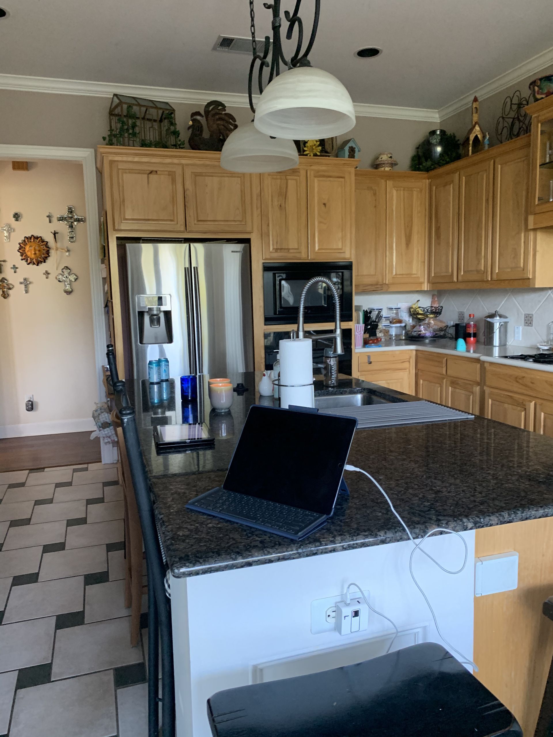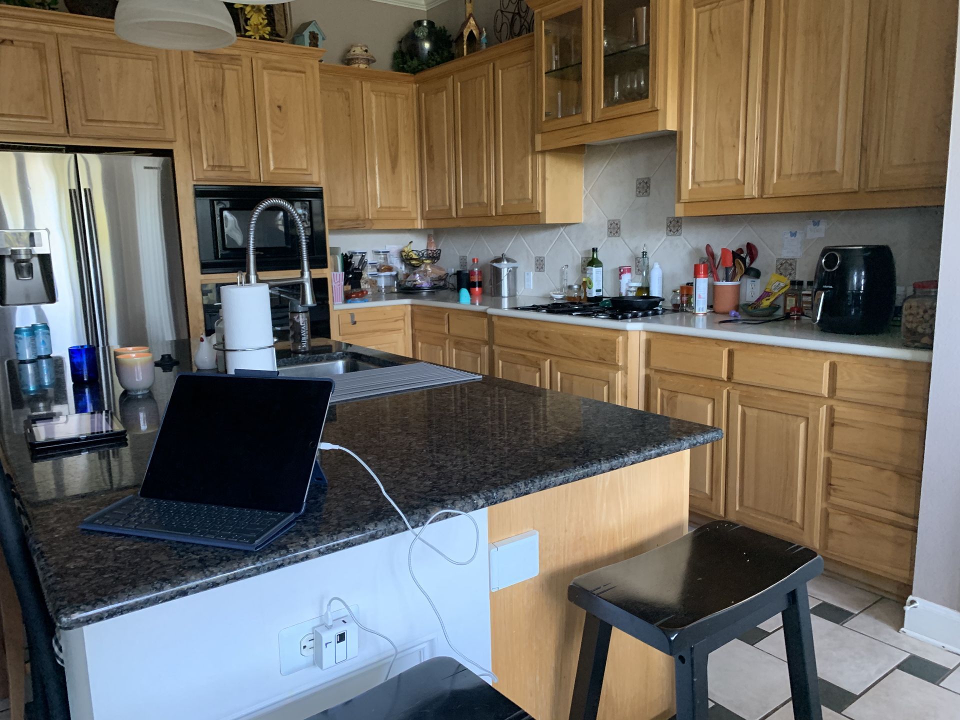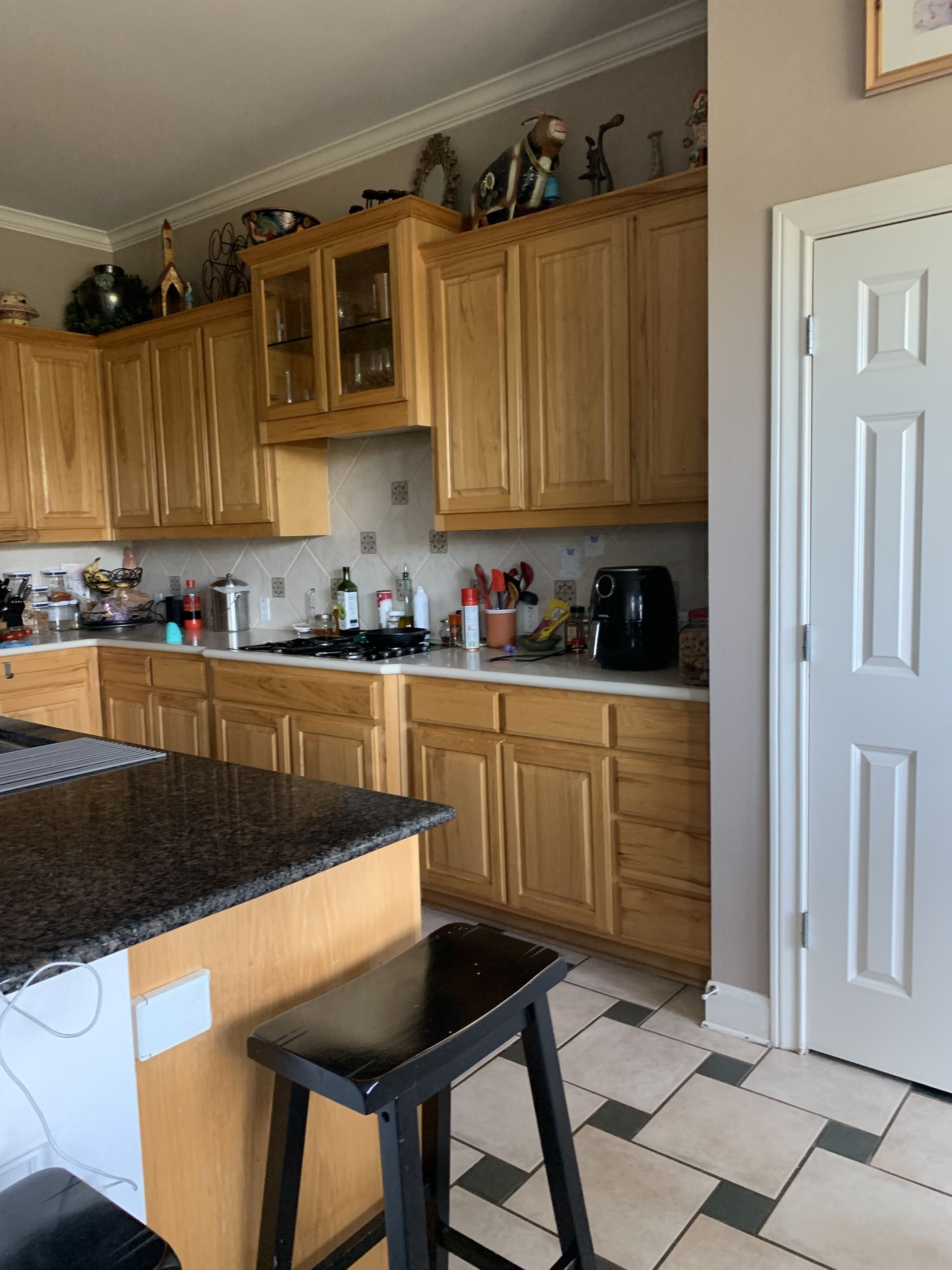 Austin, TX, 78759 - This family was looking for a lighter brighter look for their kitchen, open a load bearing wall between the kitchen and living room, and replace buffet cabinets with a peninsula to allow for a separate seating area when cooking for family events. A new countertop and improved island design, while keeping and adding to the original pecan cabinets. One design feature was to stain the cabinets with a white washed look that would allow for a lighter color while still allowing some of the grain of the pecan to show through. Custom carpentry and painting yielded a beautiful result that met the client’s desire for a brighter kitchen reminiscent of old world style with the fun of a day at the beach. Carpentry work included extending cabinets to ceiling height, island modifications to beautify the island (and new peninsula) with shiplap on end pieces and a new coffee station area. Topped with a beautiful quartzite counter, gorgeous handmade glass pendants, and herringbone pattern flooring. Simple colors loaded with texture and pattern for a beautiful result.