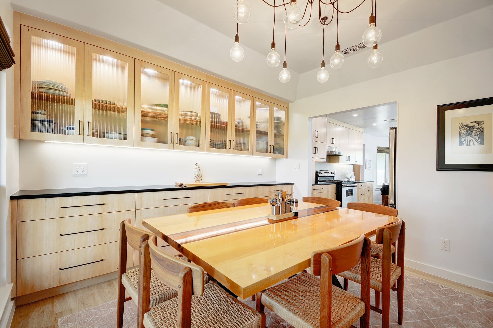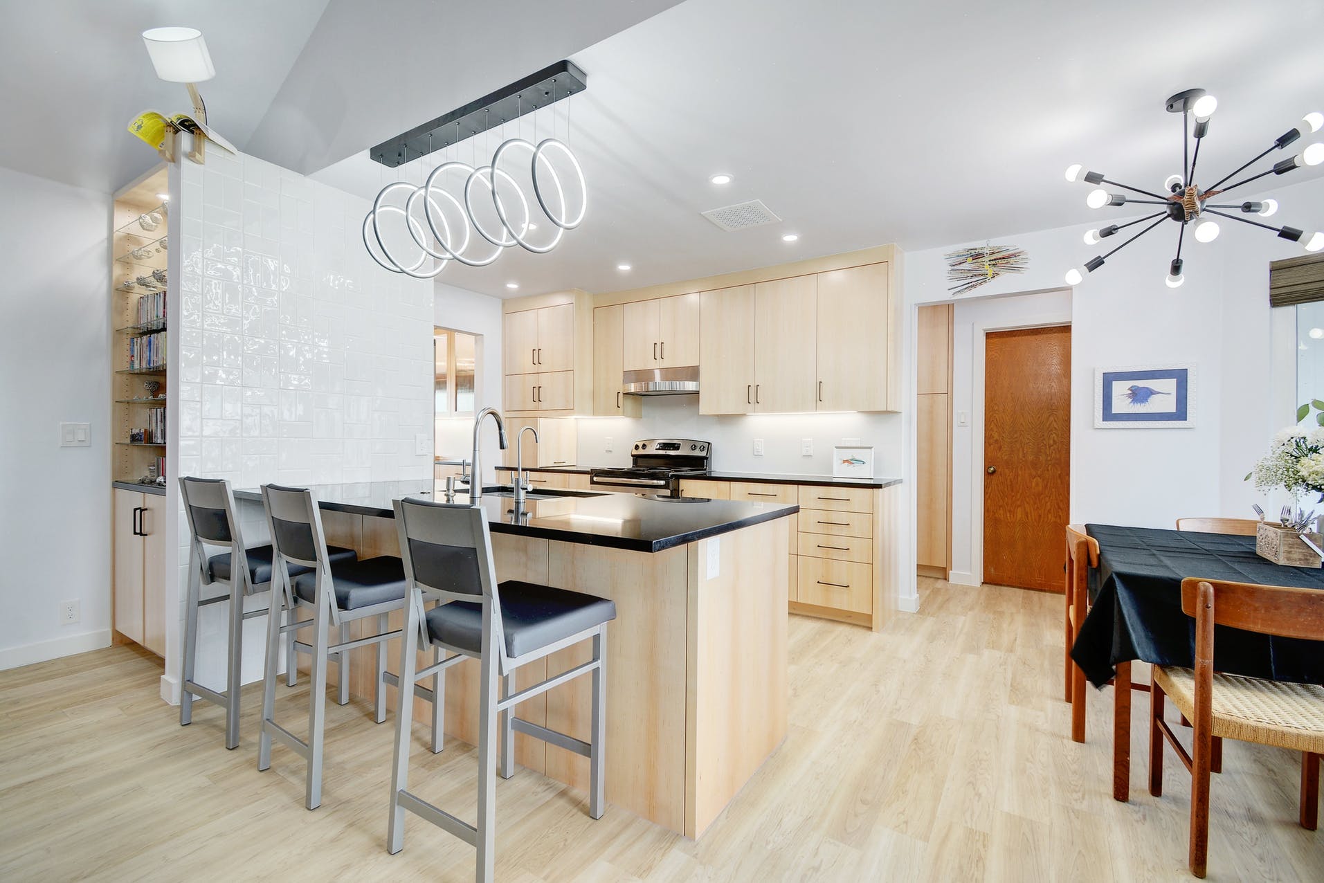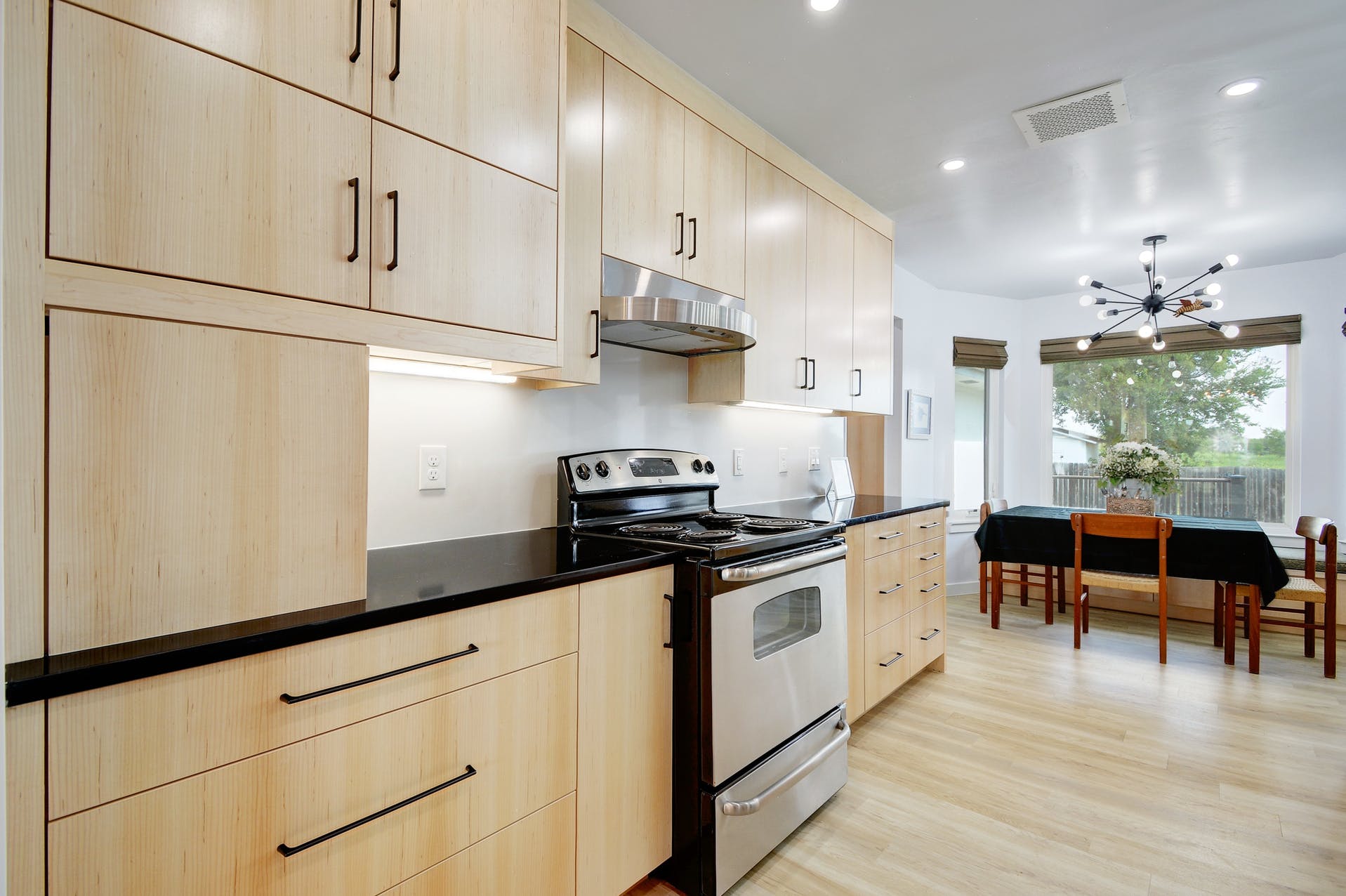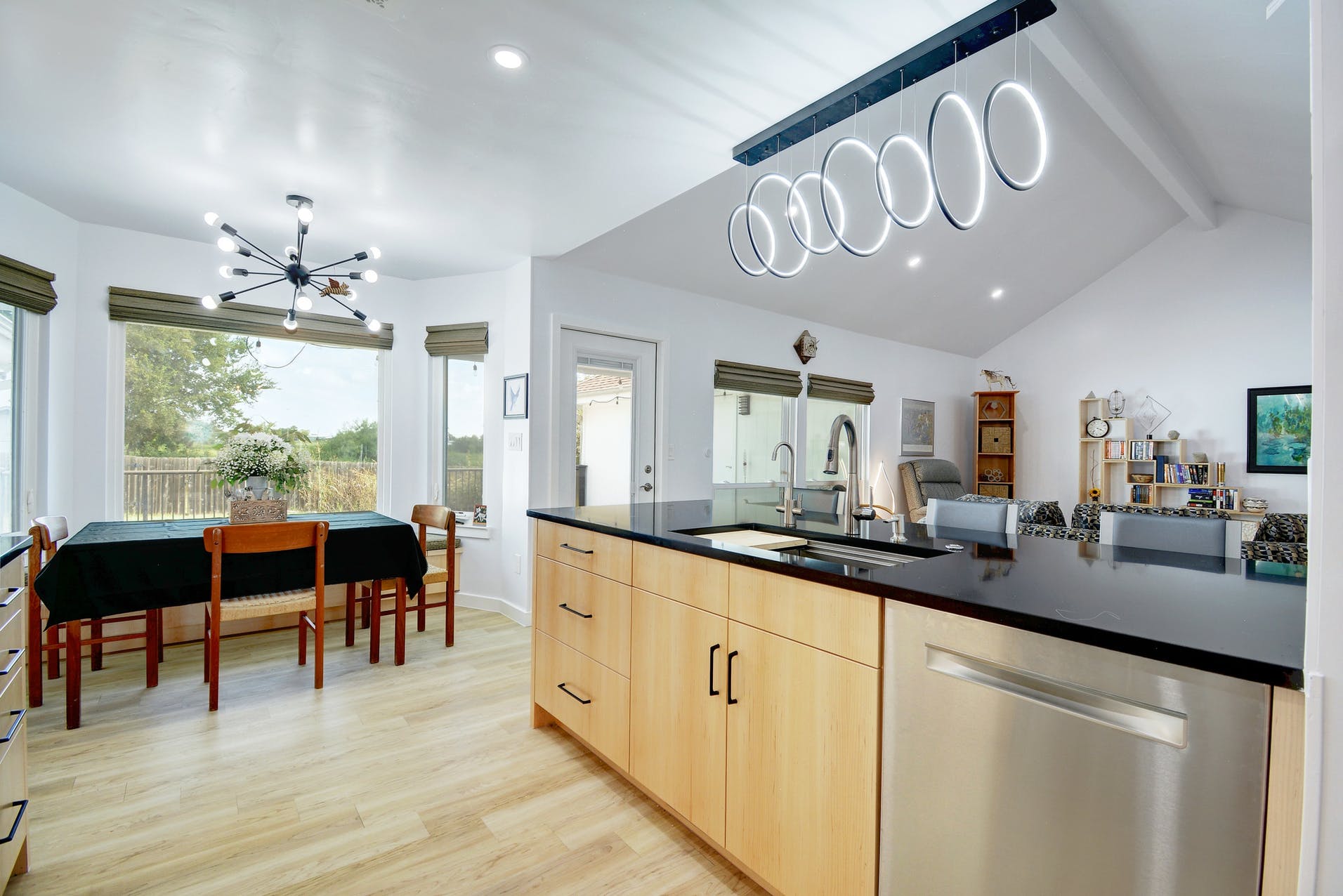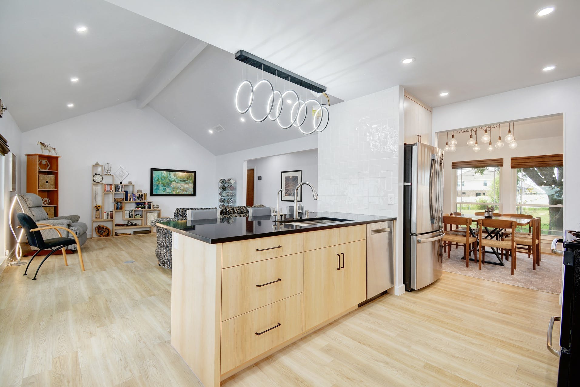 This Pflugerville client had a very clear picture of what she wanted for her home remodel - focusing on a new kitchen, dining, and living area, looking to update and modernize both in look and features. Simple and natural frameless cabinets in the kitchen and dining with black contrasting countertops and quartz backsplash provide a clean fresh look and added buffet cabinets with glass-face uppers in the dining area for added counter space for entertaining. Another key part of the project was to lift up the sunken living room, making it flush with the kitchen and hallway, and removing a large unused fireplace from the corner of the living area to open and enjoy the vaulted ceiling. New flooring and paint throughout to completely refresh the home.