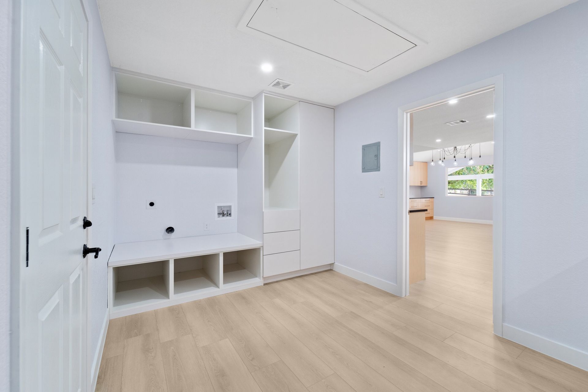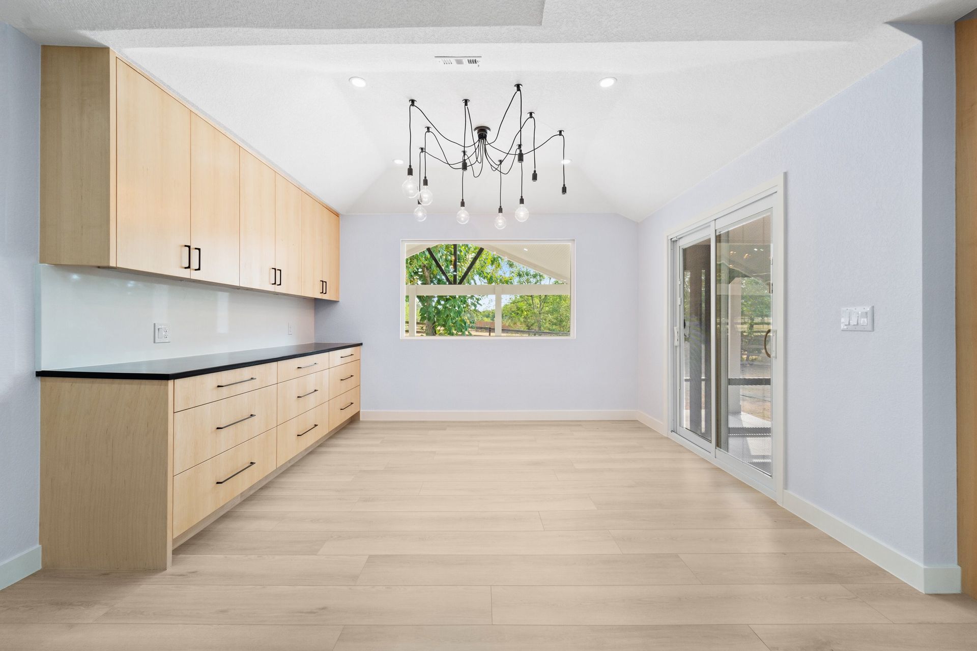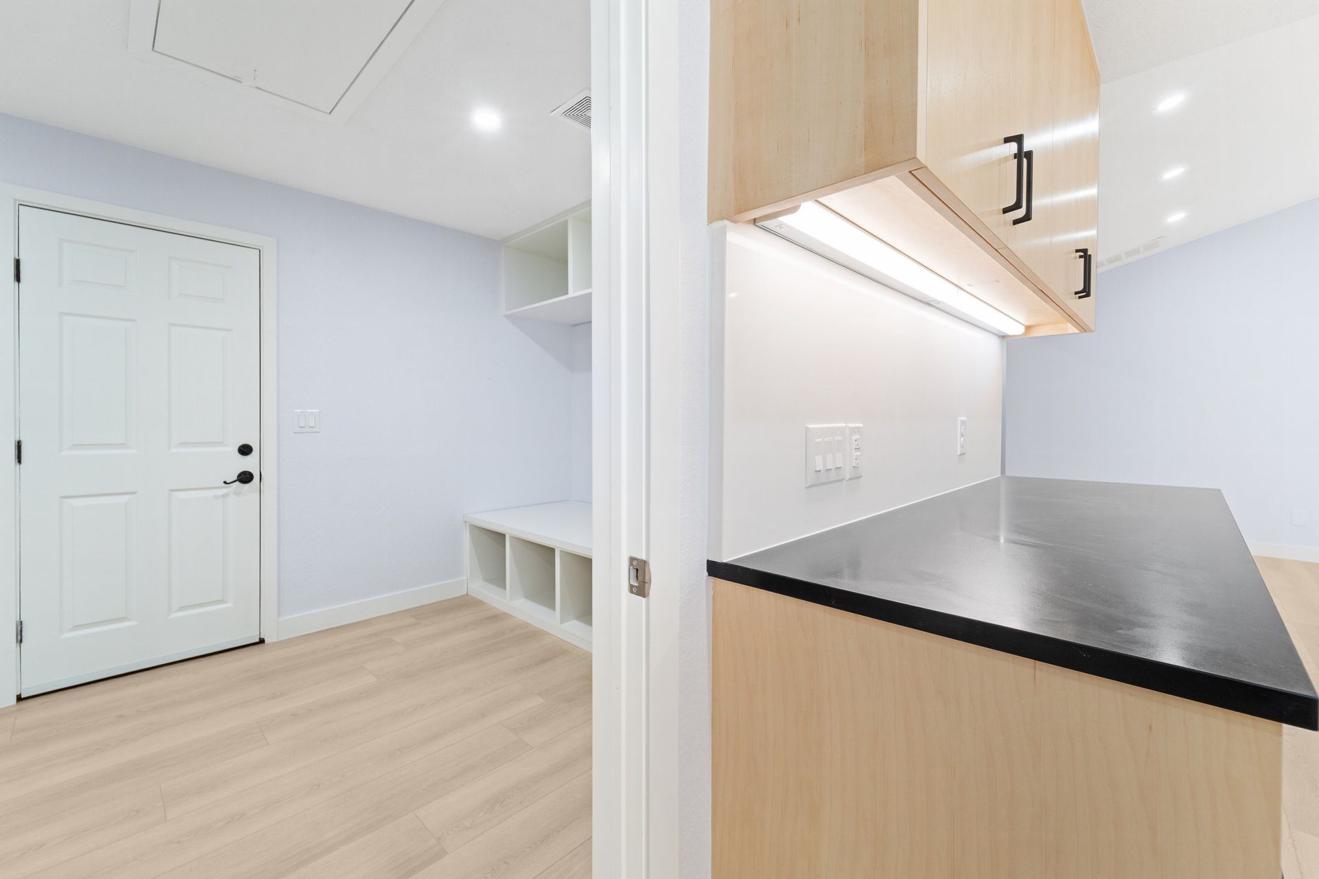 In addition to all new flooring, kitchen, and dining areas matching the previous remodel, they also wanted to give the bathrooms a makeover to better align with their aesthetic, convert part of the garage to a large mudroom/laundry/pantry area, and to do something yet undefined with the outdoor space.