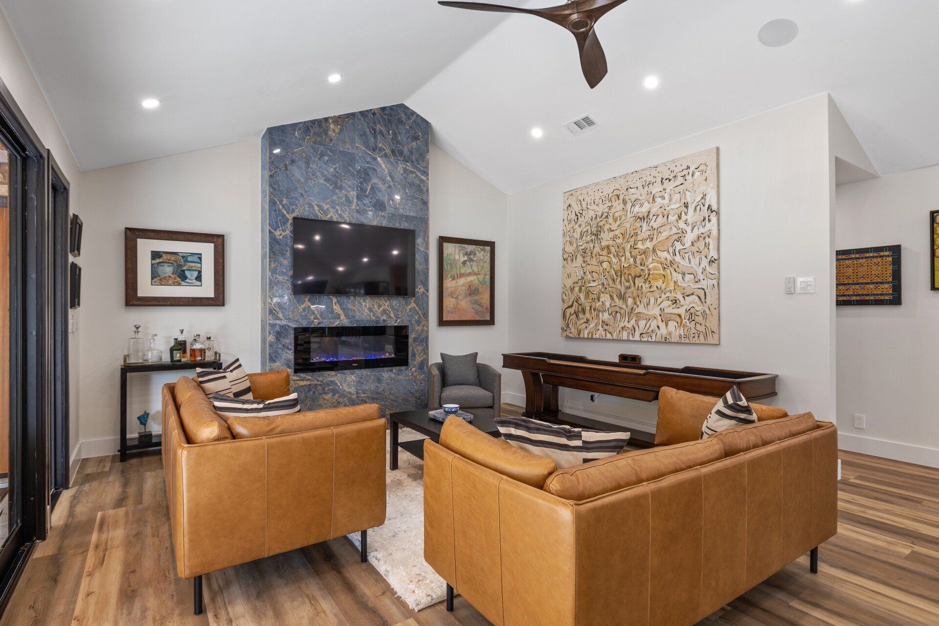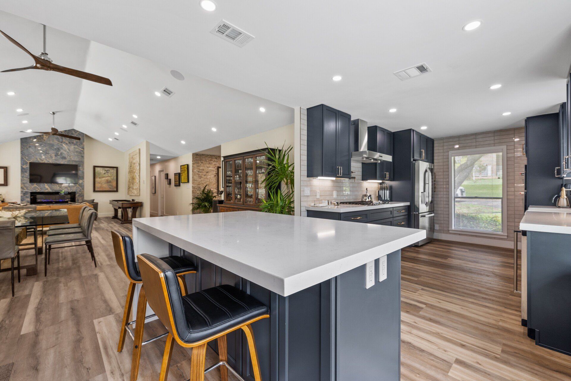 Interior finishes include luxury vinyl flooring throughout, removed popcorn, removed wallpaper and texture, new charcoal colored maple cabinets in an expanded kitchen featuring a breakfast table island with additional cabinetry below and buffet cabinets behind. A few fun finishes included a blue large format porcelain tile at the fireplace, wall tile in several areas of the home including kitchen walls, guest bath and master bath featuring a wall of 1970’s era inspired 3-D tile. The master bath featuring a “walk in the woods” theme went from 2 large closets and a small shower to one shared walk-in closet, linen cabinets for additional personal storage, large frameless rustic oak vanity, large walk in shower and freestanding tub with a view to the backyard.