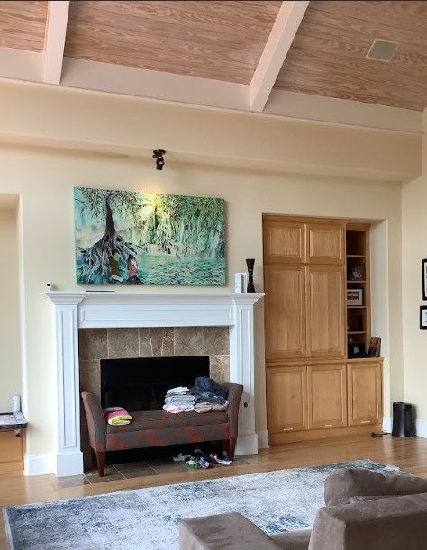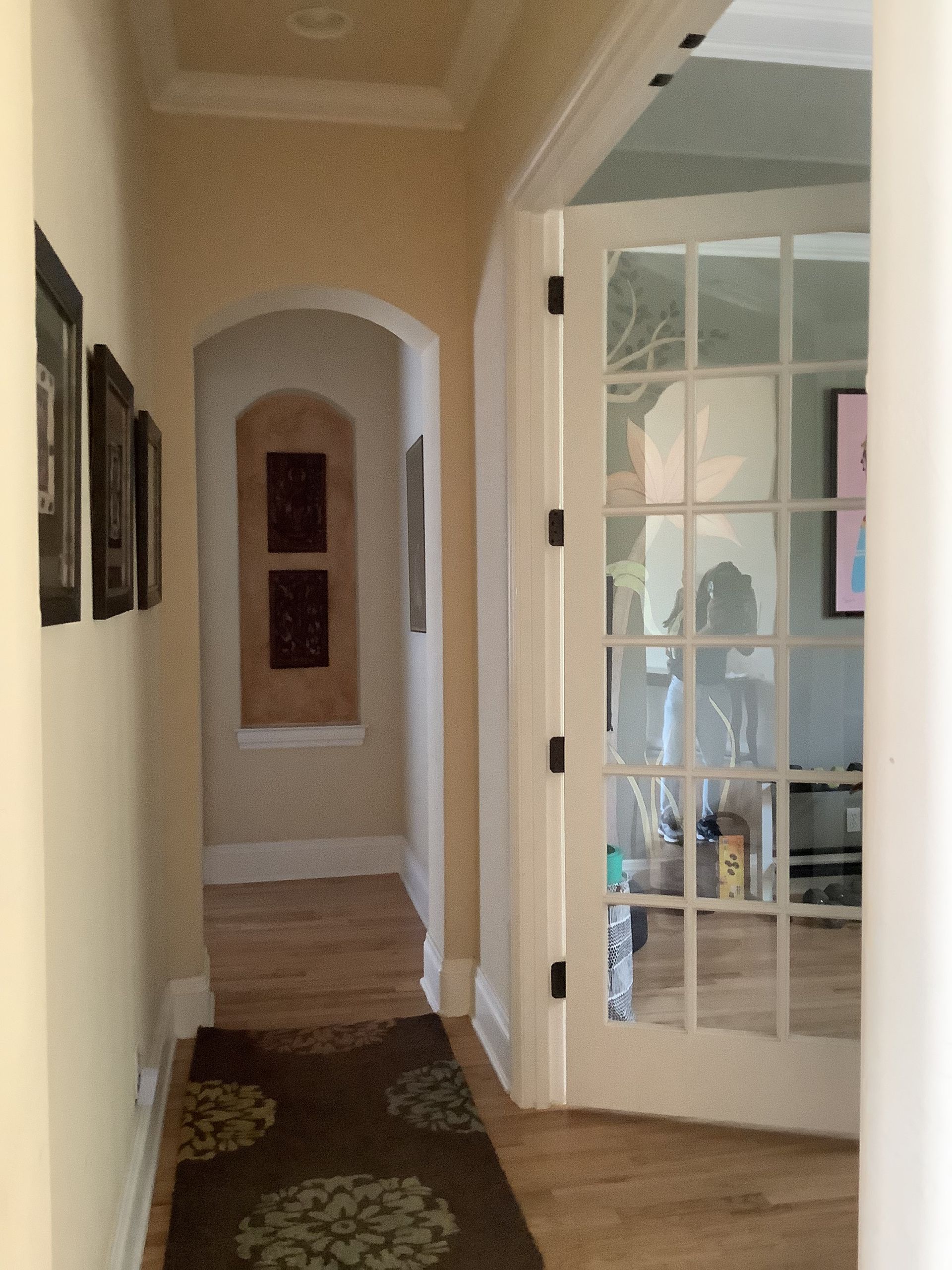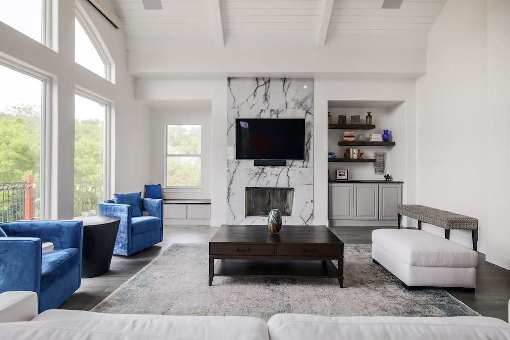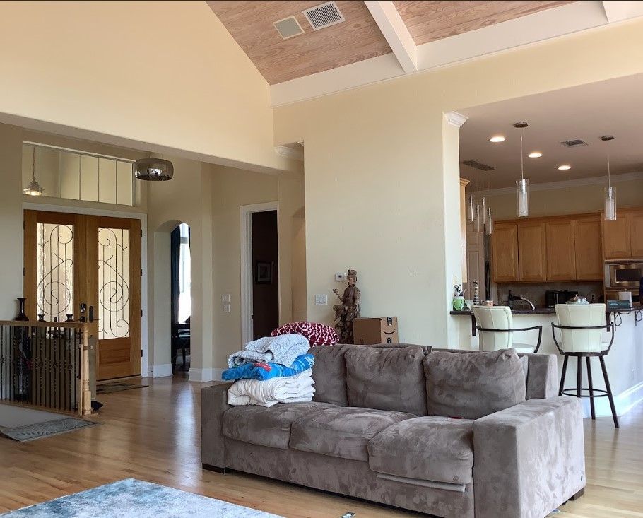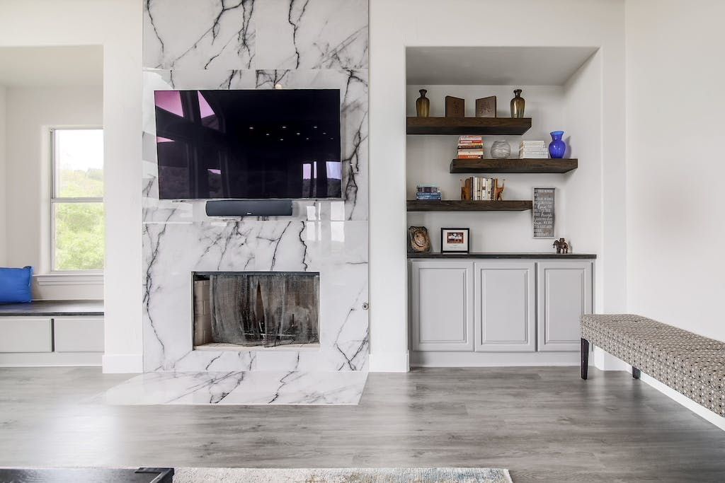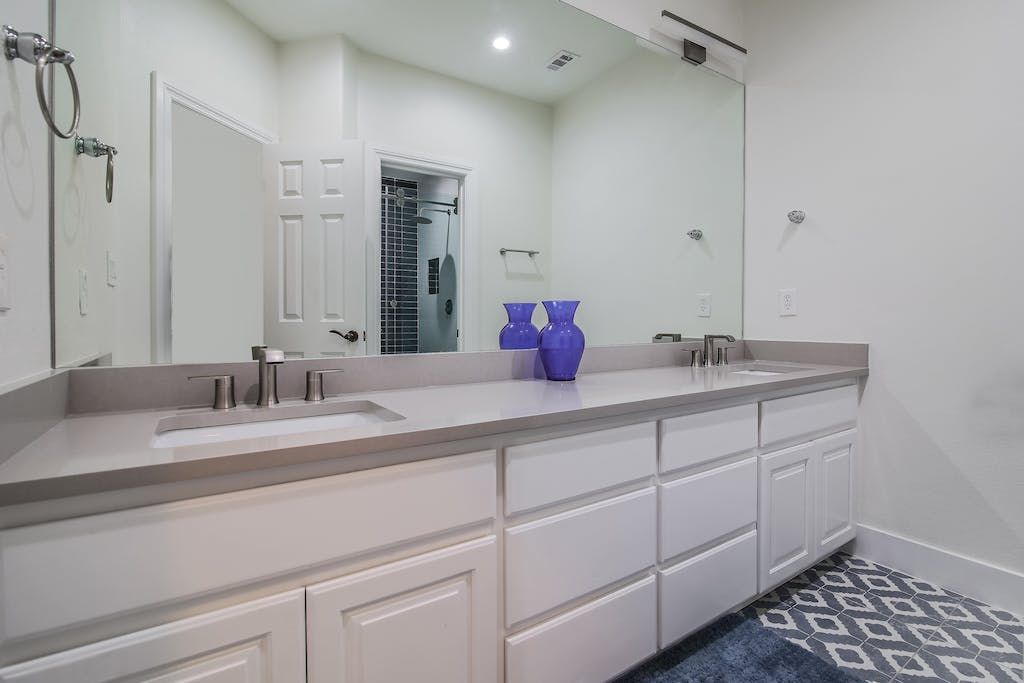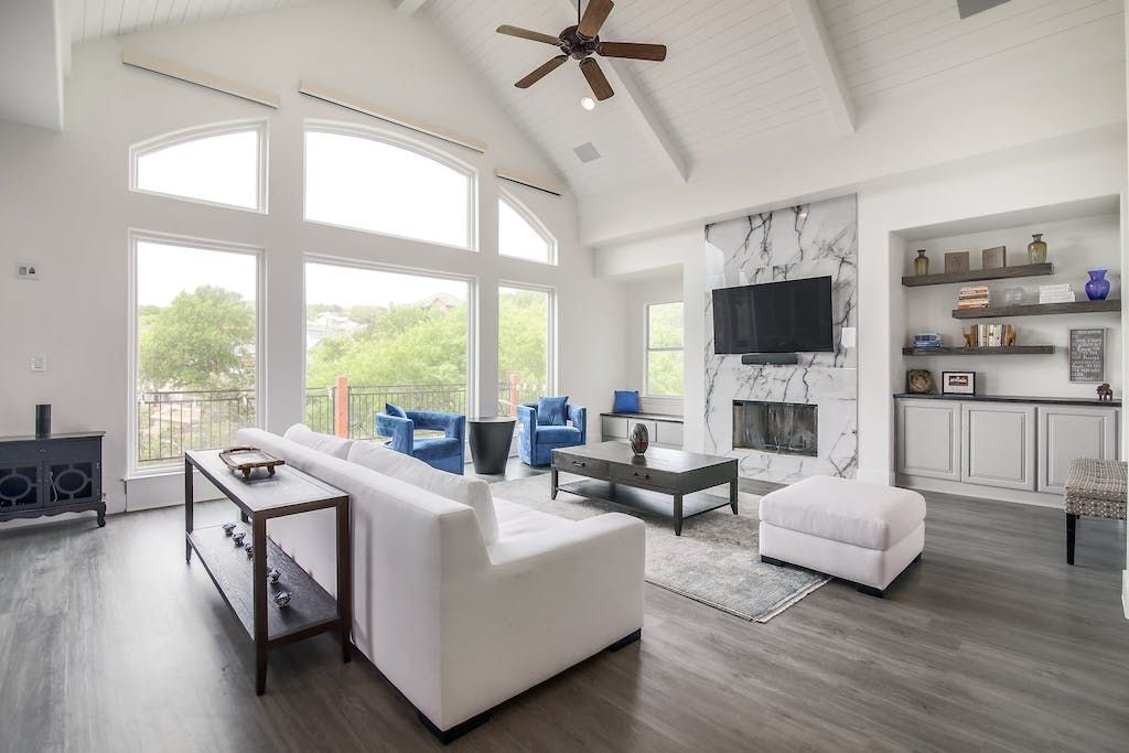 Austin, TX, 78731 - A priority for this Northwest Hills family in Austin was to lighten and brighten the home, moving from old yellows to crisp whites, grays and touches of blue, along with a few dark wood accents. A complete redo of the kitchen included opening the kitchen area to the living space, removing a small island and a peninsula for one island large enough to fit four comfortably and added side overhang for a couple more when entertaining. New flooring and painting throughout, buffet cabinets and wet bar for the dining area, and converting a portion of the garage to a walk-in-pantry. Instead of replacing the front door, we refinished, removed the out-dated grate, replaced glass, and tiled the entry concrete. For the kids - a remodel of their bathroom focusing on replacing the tub-shower combo with a beautiful new tiled walk-in shower. A beautiful new home for a beautiful family! It was an honor serving you all!