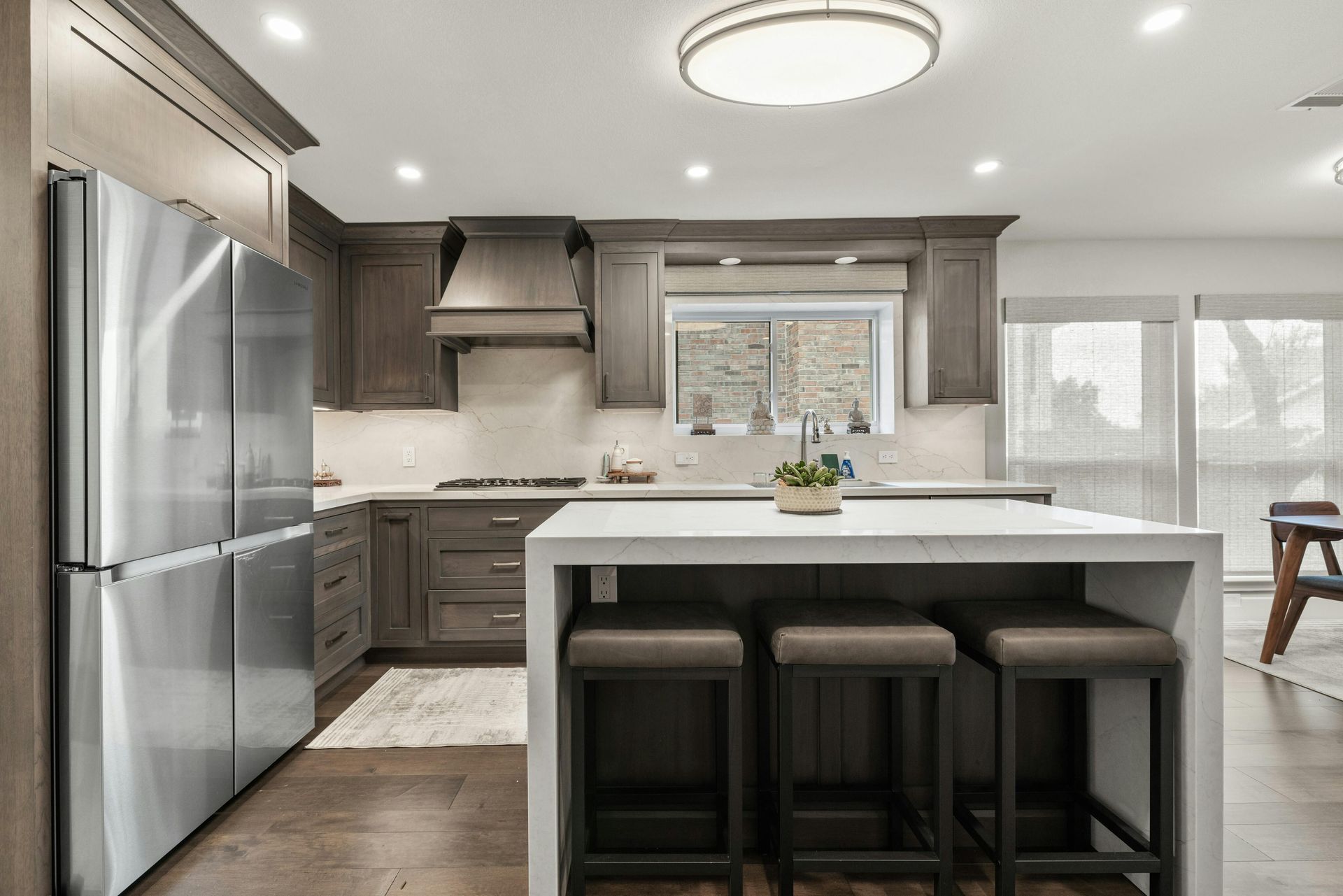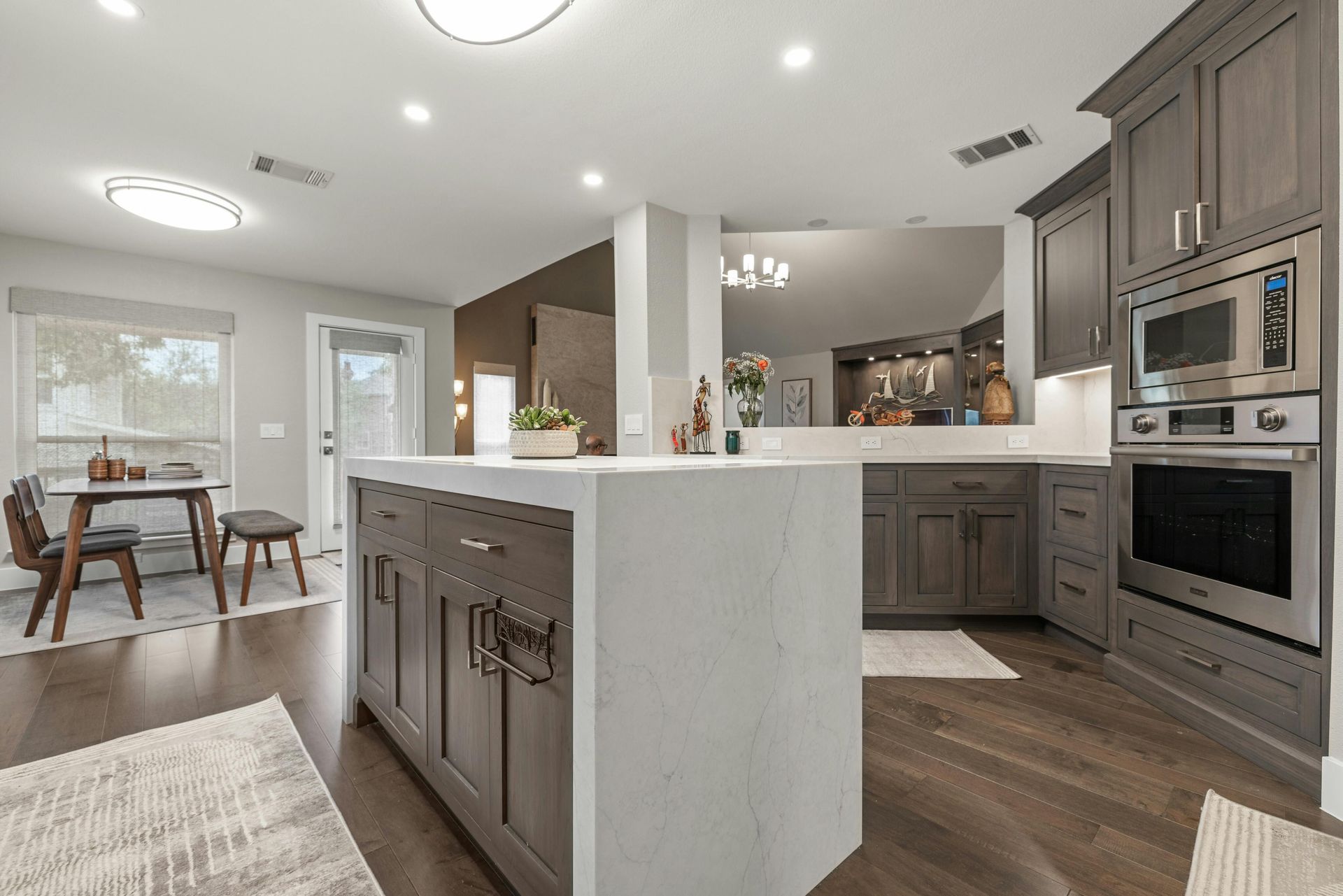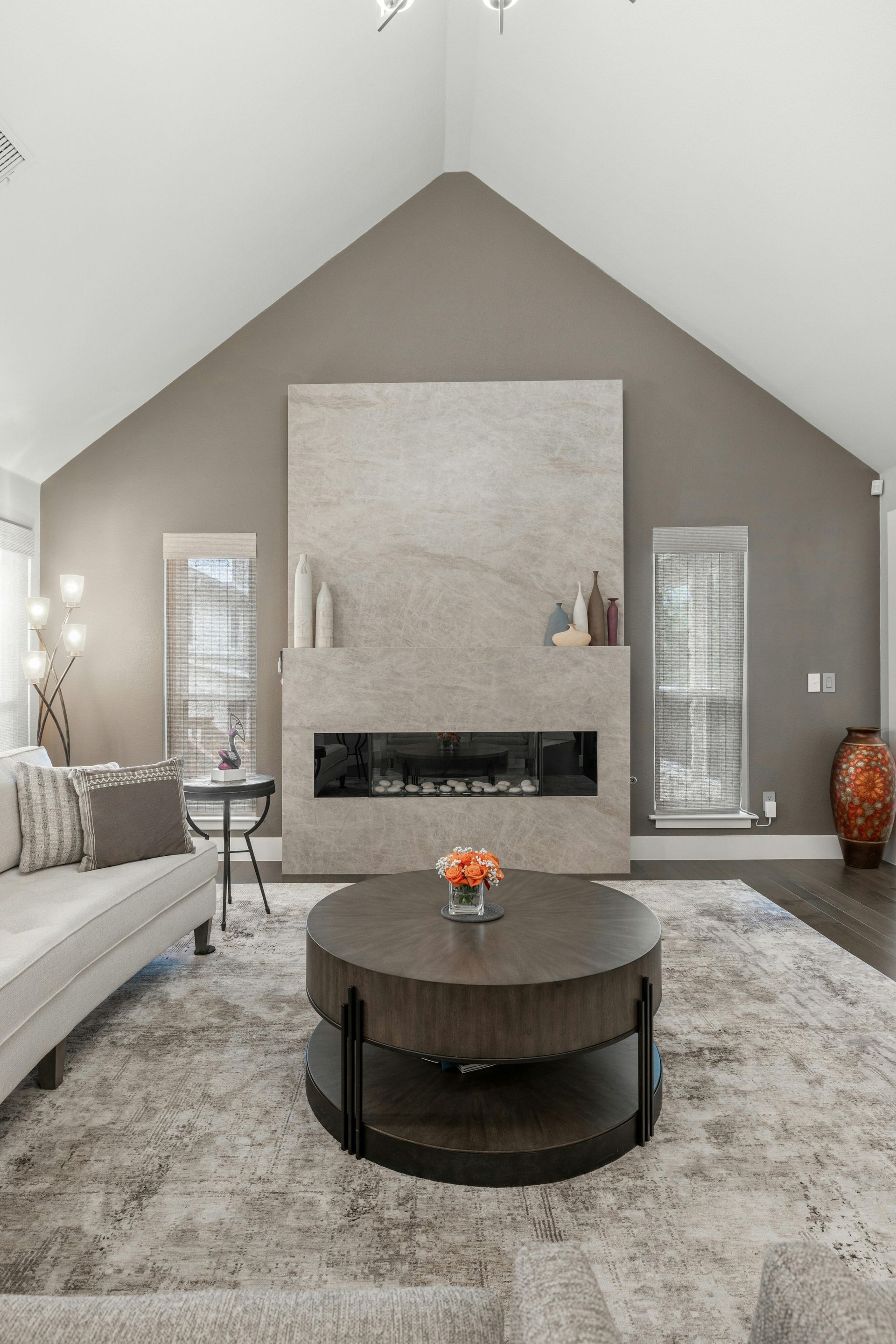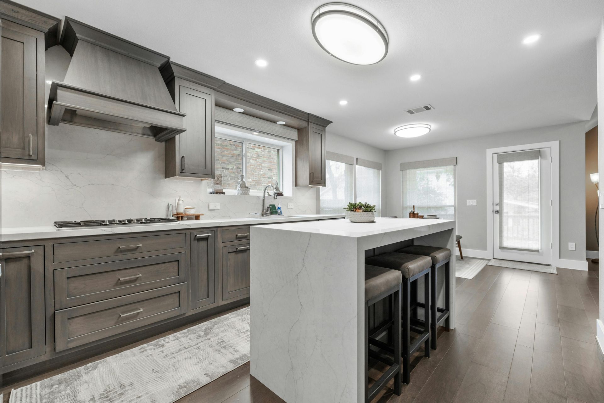 Austin, TX, 78726 - These Austin homeowners had been waiting a long time to select a provider for their whole home remodel, wanting to have some very specific details for their new home, focusing on removing awkward angles from the living room ceiling, and custom porcelain slab and carpentry work for the fireplace, living room, and home entry, and other updates. And it came out stunning!