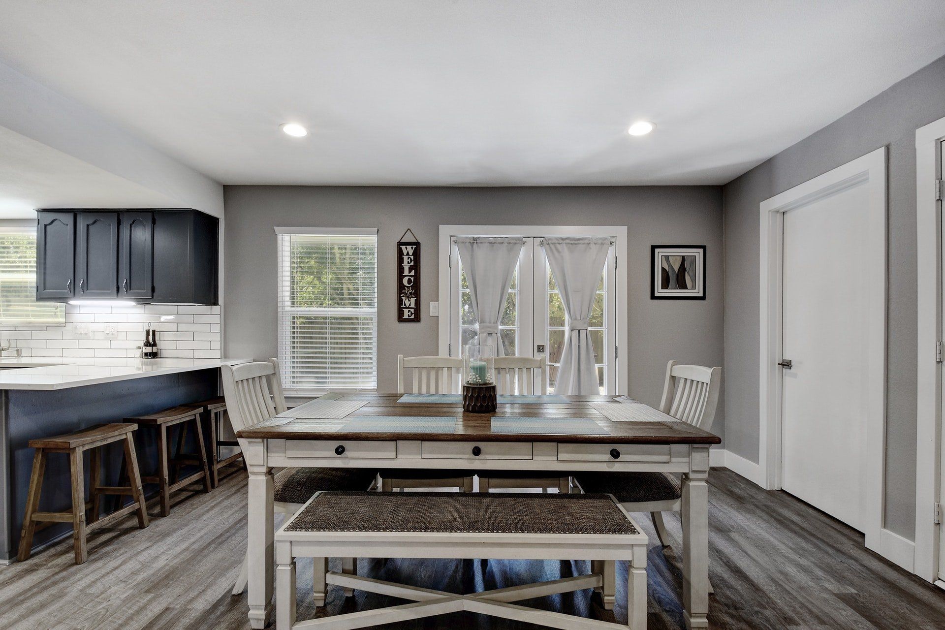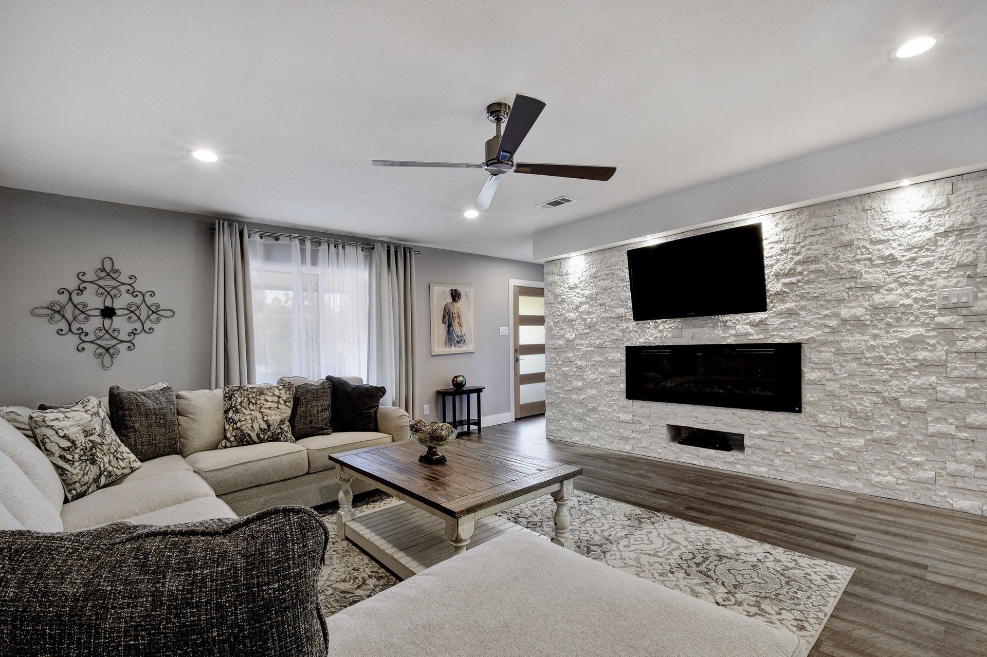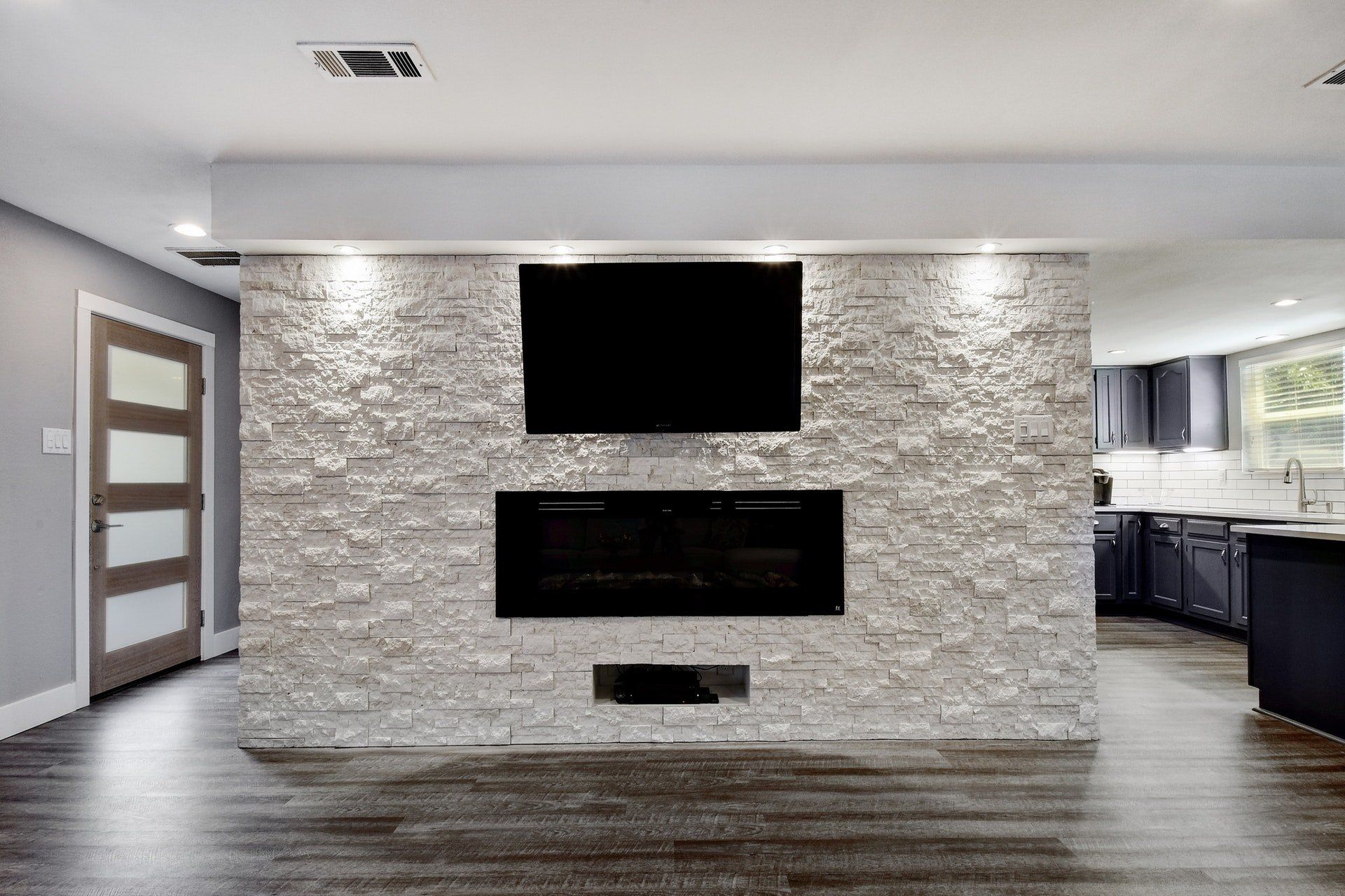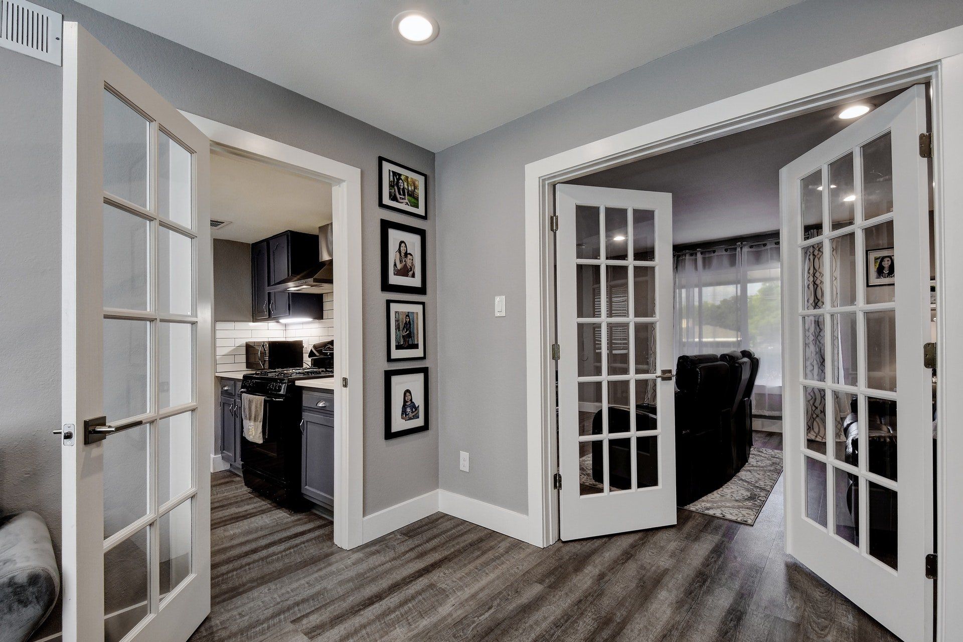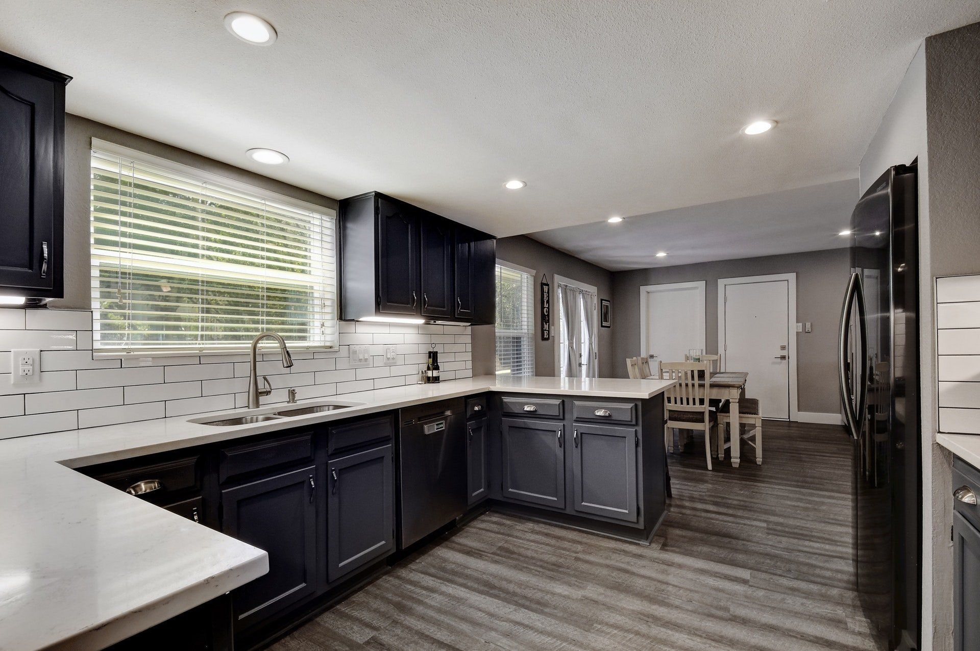 This family was really looking to update the home they love to live and play in. Like many families, also adding a beautiful and functional home office was at the top of the list. A common add for our whole home remodels is french doors to allow the home office to be open but still close off for privacy. New flooring, painting, and a beautiful accent wall for the entertainment center, plus a theater room with room for friends and family to come together for a fun movie night! For the kitchen, cabinets in good quality can be painted, here a beautiful navy color, with white backsplash and counter bring a new modern look while removing a row of upper cabinets and extending the countertop for a bar top seating open the kitchen to the dining and living areas. TRS also helped with selecting a few new pieces of art for the walls. A recent revisit to the family found that even in this well-used and well-loved home the remodel is in the same perfect and beautiful condition it was in years earlier when completed.